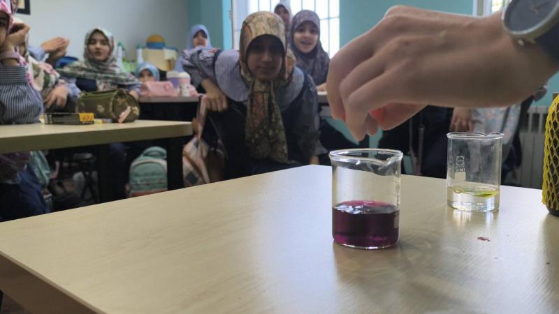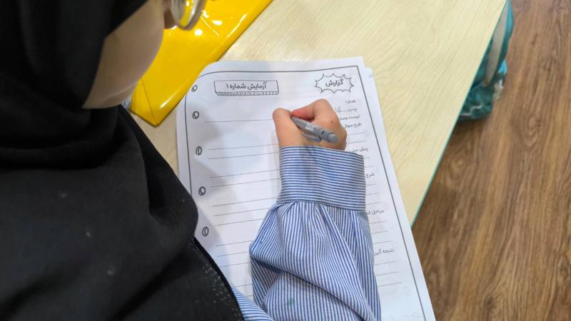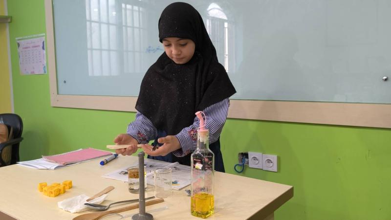 آزمایش رنگبریدر این آزمایش، دختران با مفهوم رنگبری آشنا شدند؛ فرایندی که در کارخانههای کاغذسازی باعث میشود رنگ چوب گرفته شود و کاغذی سفید به دست آید.آنها با برخی مواد رنگبر صنعتی آشنا شدند و بهصورت عملی مشاهده کردند که چگونه رنگها در اثر واکنشهای شیمیایی تغییر میکنند.در واکنش میان پتاسیم پرمنگنات و آباکسیژنه، رنگ بنفش محلول بهتدریج از بین رفت و به رنگی شفاف تبدیل شد؛ تغییری شگفتانگیز که این سؤال را در ذهن دختران ایجاد کرد:به نظر شما چرا رنگ ناپدید شد؟در ادامه، با مواد رنگبر دیگری مانند گاز کلر و آب ژاول نیز آشنا شدند.